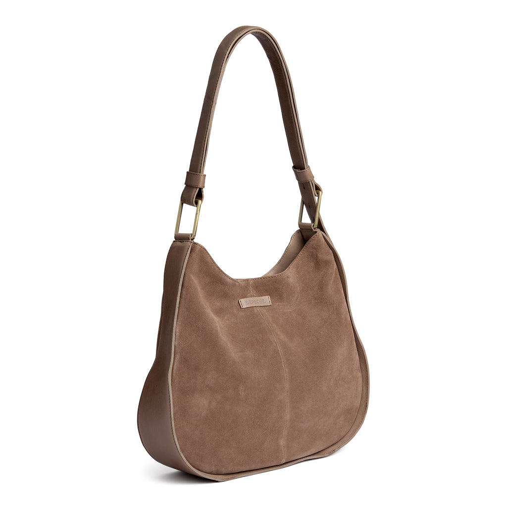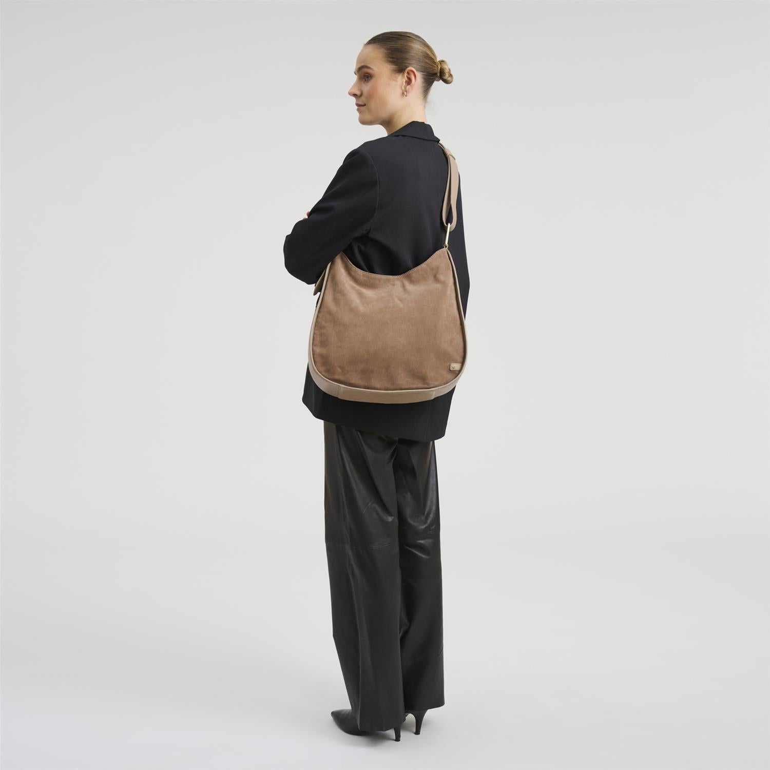 Vesken er fremstilt i en herlig kombinasjon av mykt ruskinn og glatt kuskinn, noe som gir en spennende kontrast mellom materialene og ett luksuriøst og moderne uttrykk. Den elegante silhuetten gjør vesken ideell til både hverdagsbruk og til mer formelle anledninger.