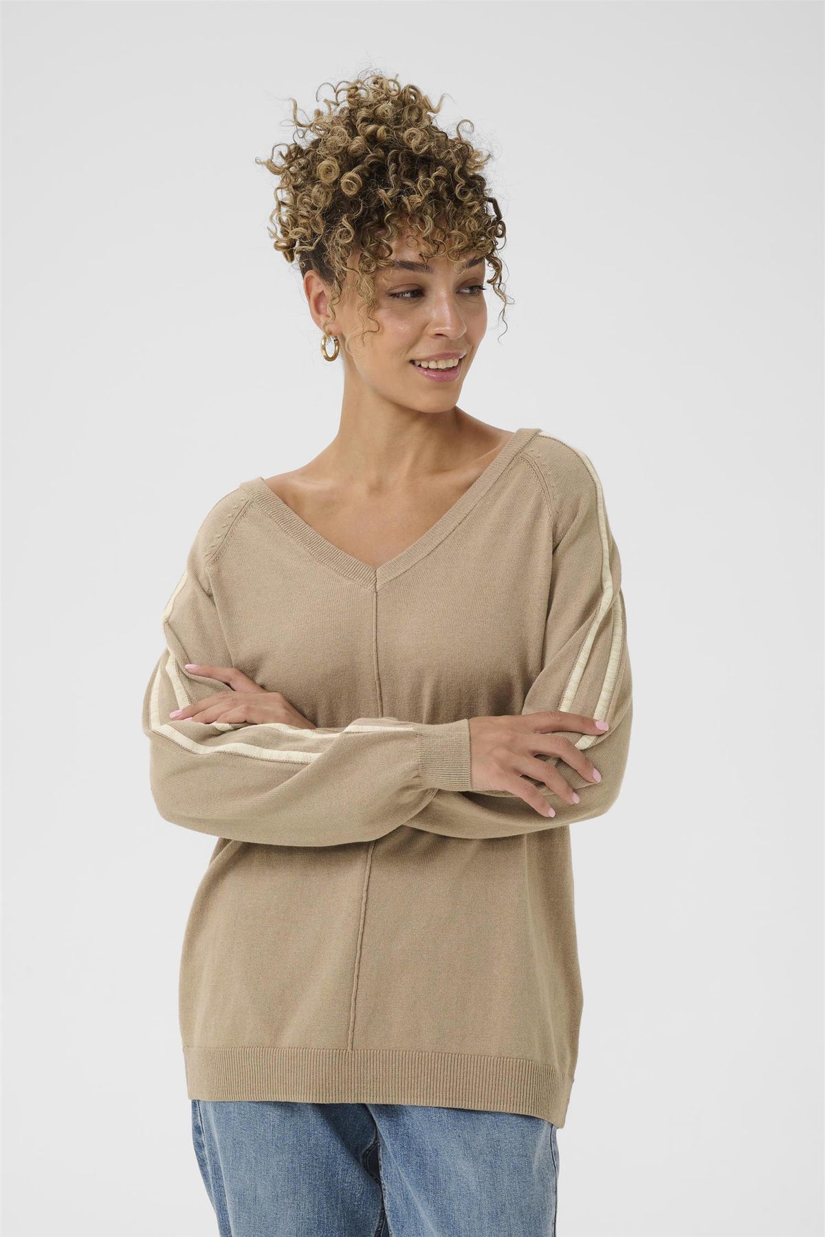 Fargen er en anelse mørkere enn på bildet. Stripene på ermene er i fargen creme og har gulltråd vevet i. Innfesting av ermer har raglan felling.